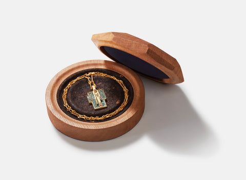 Every piece of jewellery is housed in a bespoke box created from sustainable or reclaimed timber, recycled fabric and cork, created in collaboration with Londonbased furniture maker Jan Hendzel Studio. The cork inserts can be removed so that the boxes can be used for other purposes in future.